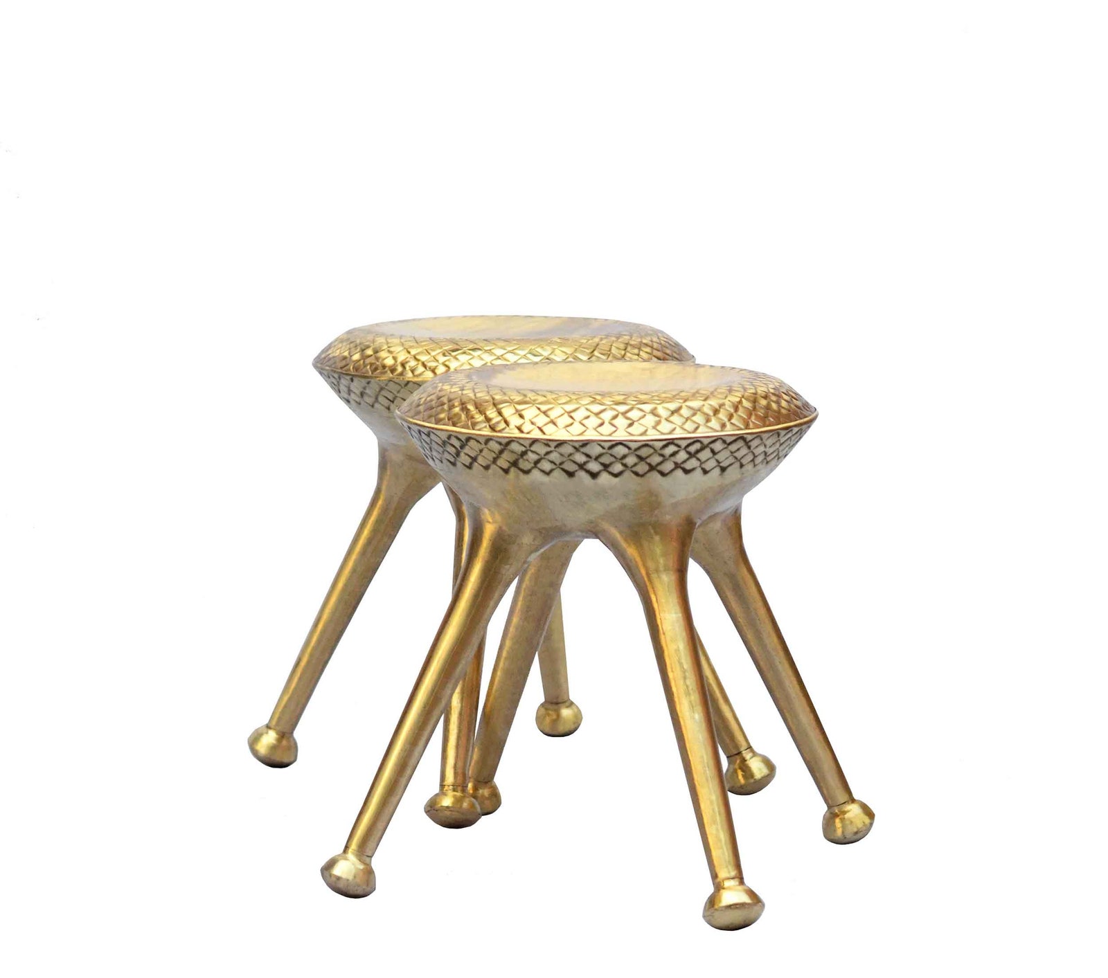 objects. His collection 'Pitoloi' comprises small stools and a barstool, made of sheets of brass shaped